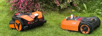 Als Beispiel links der Worx Landroid Vision M600 WR206E, der sich nur mittels Kamera orientiert und ihm gegenüber der Worx Landroid WR167E M Plus, der seinen Mähbereich innerhalb des Begrenzungskabel findet.